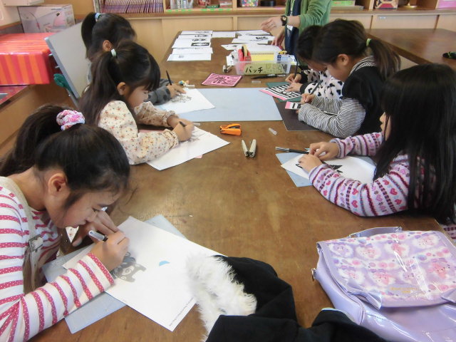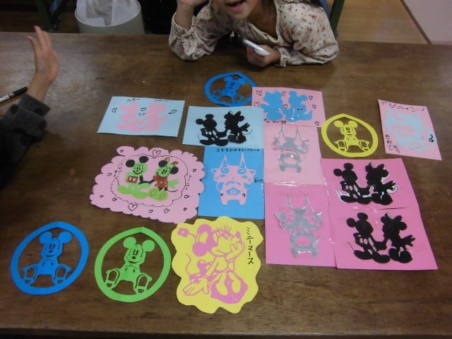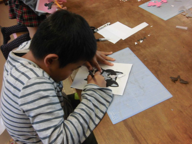 小学生のお友達と、紙とカッターを使って模様や絵を作る『きりえ』を行いました。