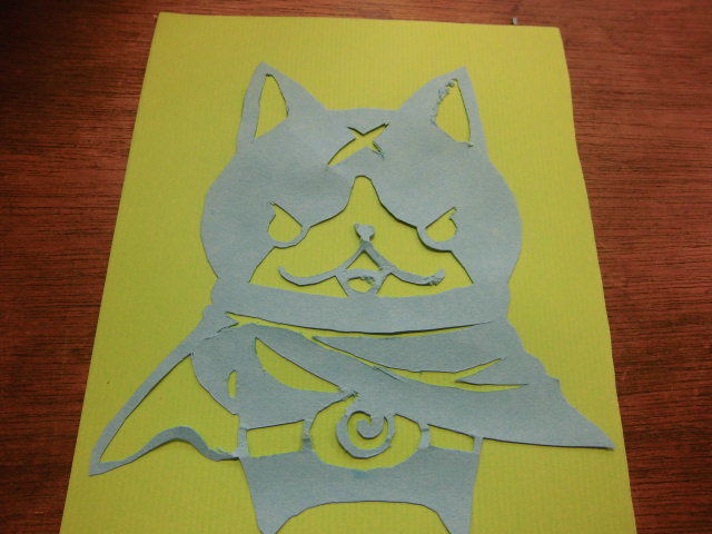 型紙と画用紙を重ねてカッターで絵をなぞるように切込みを入れていきます。