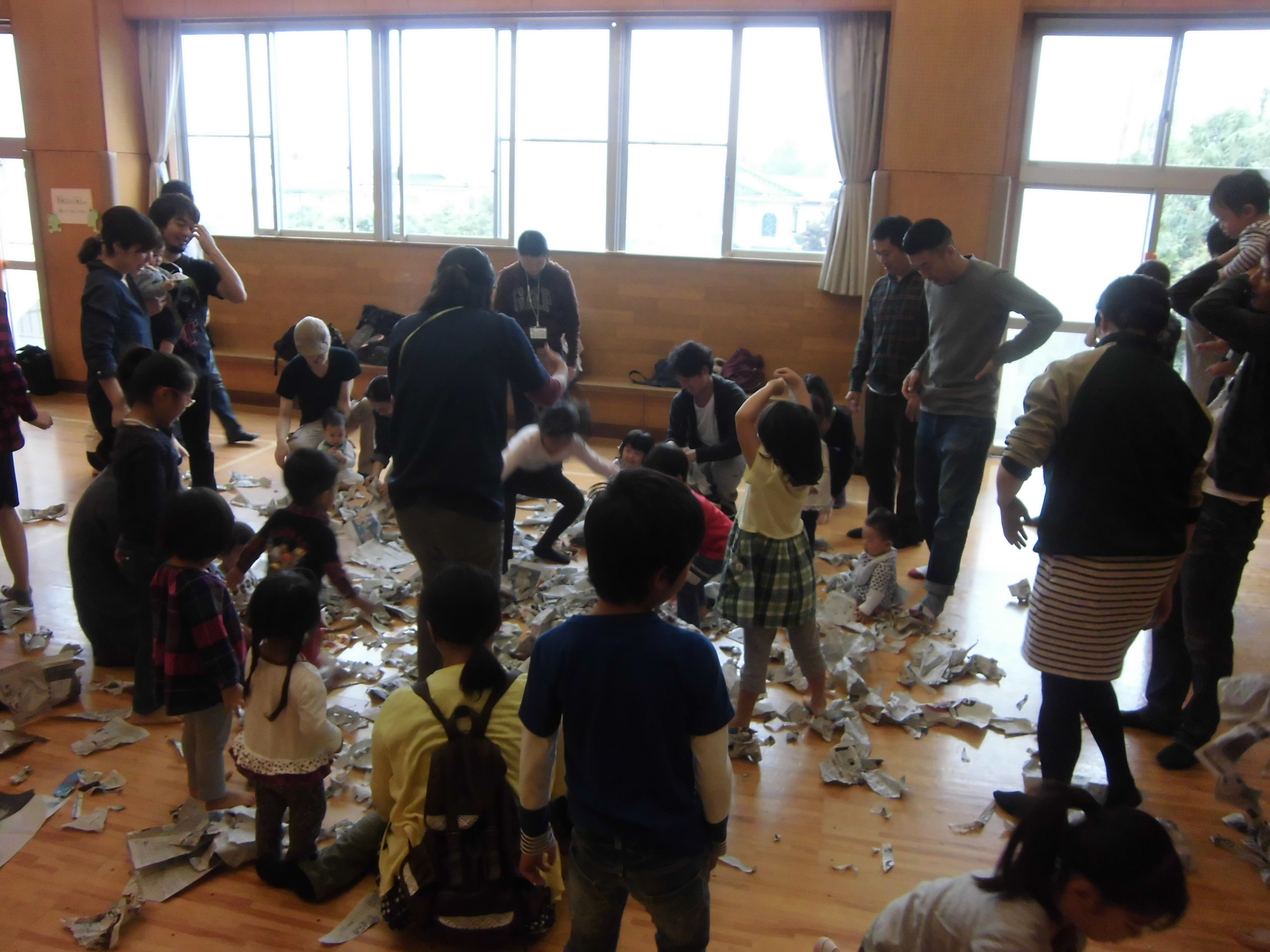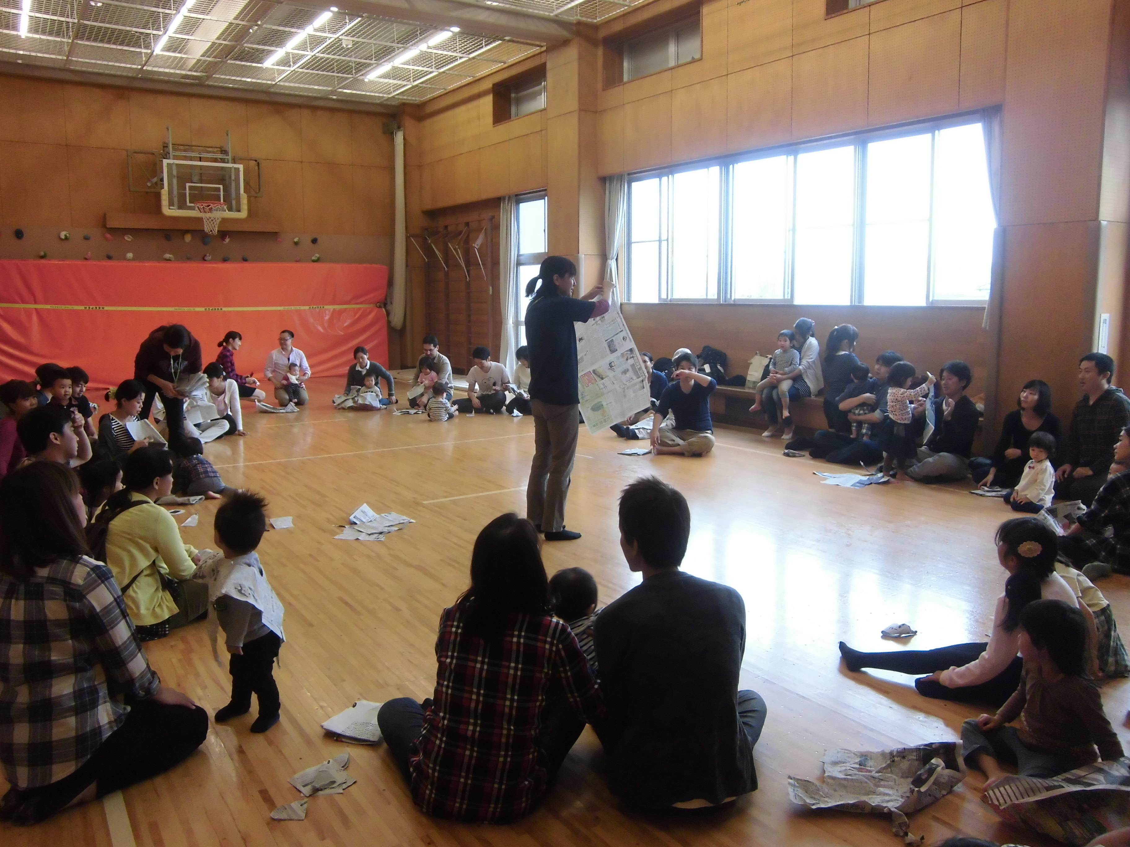 みんなでアンパンマン体操やリズム・ふれあい遊びをしたり、新聞遊びや紙ひこうきで競争をしたり…